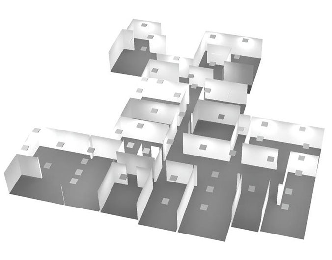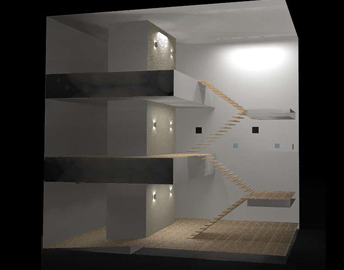 Estudio de iluminación para áreas en común Edificio Prisma, utilizando iluminación lineal y downlights con luz directa e indirecta.