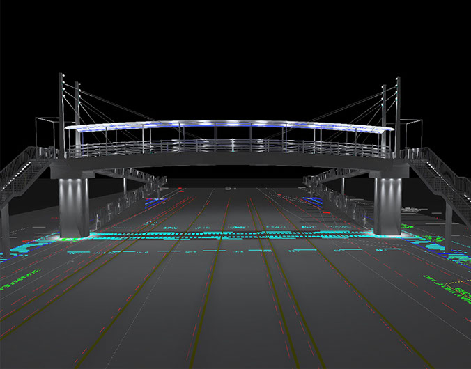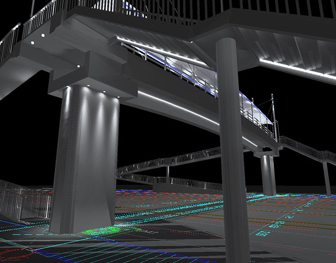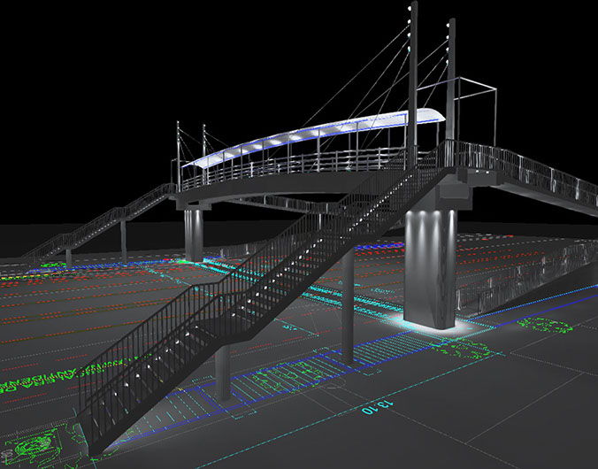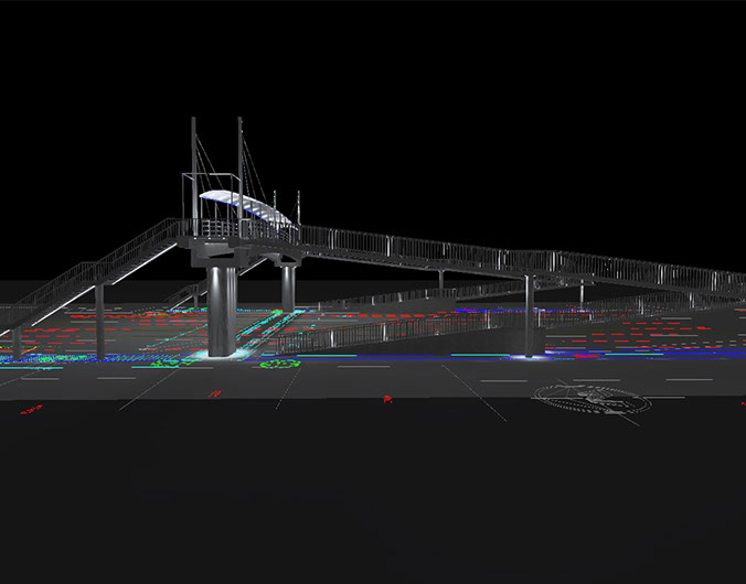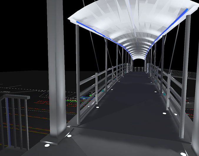 Estudio de iluminación para puente peatonal San Benito, proponiendo luminarias con tecnología para el ahorro energético y con una estética diferente que hace que la vista del puente sea mas limpia.