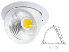 Luminario circular, de empotrar, retráctil-dirigible, de 21.5(ø)x17.5(h) cms., fabricado en inyección de aluminio, dirigible, horizontal 358° y vertical 40°, con reflector de aluminio, con difusor de vidrio claro templado, y con disipador de temperatura integrado. Equipado con un módulo de leds de alto flujo, con una potencia total de 30w (2,100 lm.), blanco cálido (3000k), y con una fuente de alimentación, remota en caja, de voltaje universal 120- 277v.